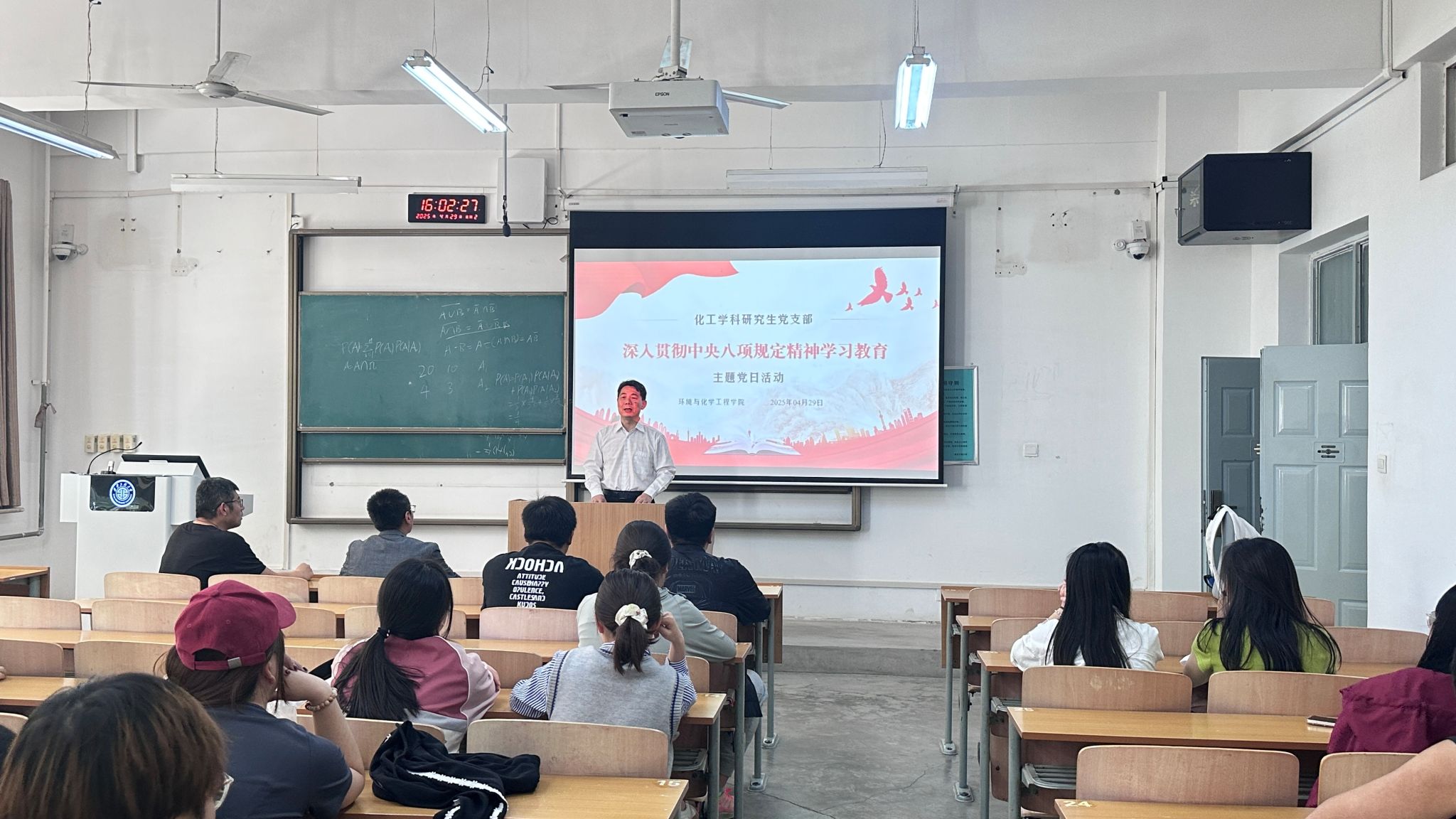 为深入学习贯彻中央八项规定精神,进一步强化党员廉洁自律意识,化工学科研究生党支部于4月29日在A座教学楼102教室召开了“深入贯彻中央八项规定精神学习教育”专题学习会。会议由党支部书记王毅博主持,学院党委书记胡西民、副书记林定武以及支部全体党员参加了此次学习会。会上,胡西民向全体党员详细介绍了中央八项规定的主要内容和重要意义。他指出,中央八项规定是新时代全面从严治党的重要抓手,是党员干部必须严格遵守的...