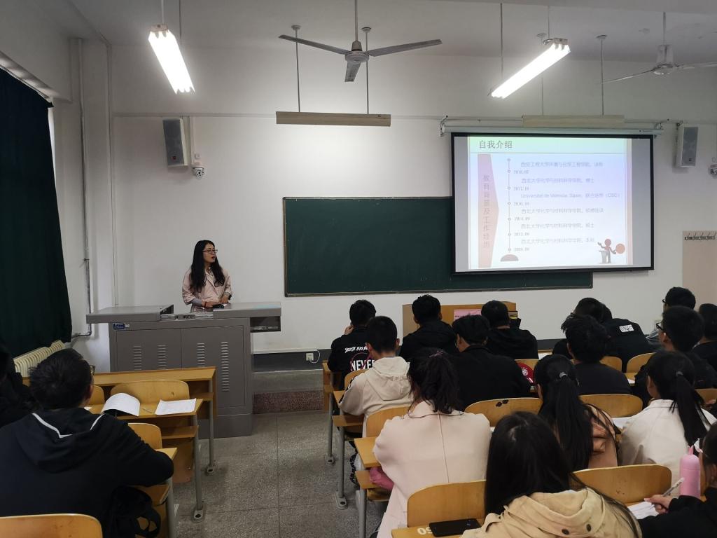 介绍会开始,屈晓妮老师首先组织参会学生填写调查问卷,随后和同学们分享了个人经历并对应用化学专业的发展方向做出了详细的解读,包括:专业解读、学习方法、相似专业、就业发展、竞争专业、竞争因素。同时强调了尽早进入实验室操作的重要性,她表示越早进入实验室进行实验越有利于我们今后的学习发展。